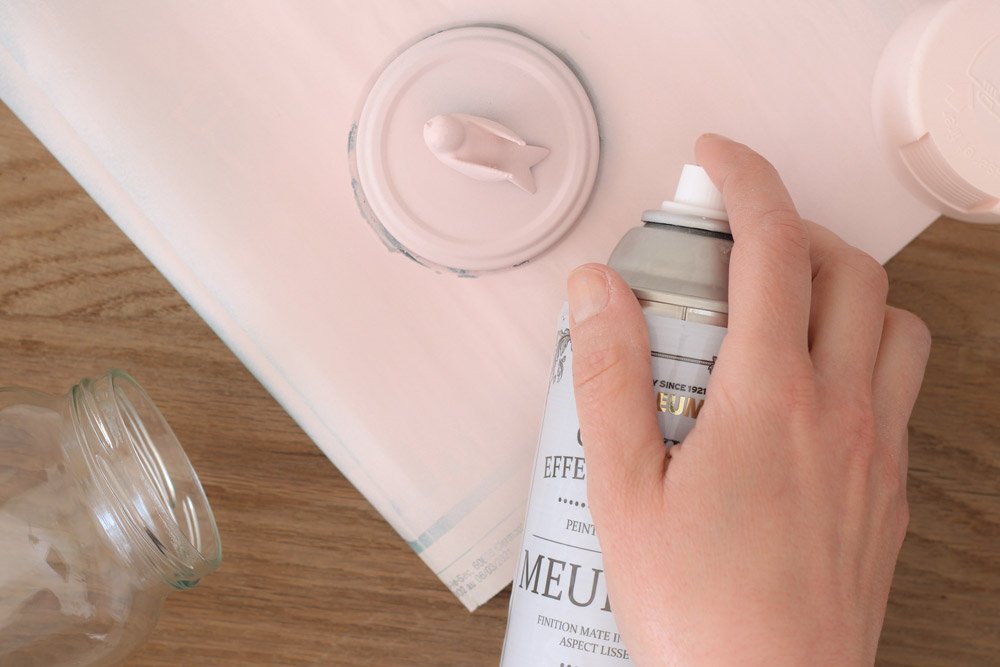- une bombe de peinture (ici rose de Chine effet poudré de Rust Oleum dont le rendu est hyper mat, poudrée mais lisse. Une autre option possible est les sprays Edding mat)