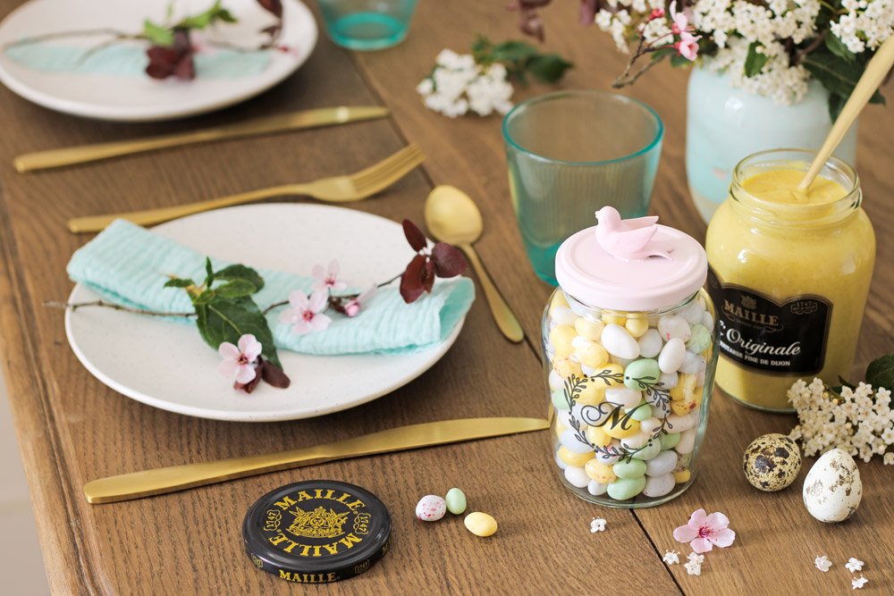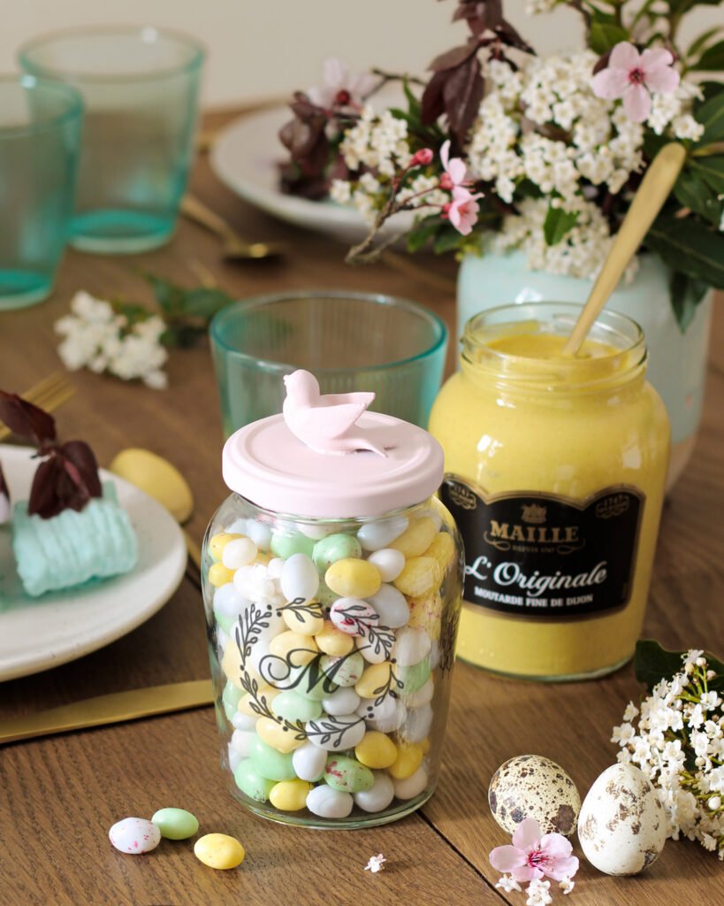 Les pots de moutarde, chez moi, ça descend aussi vite que le paquet de chips à l’apéro (je suis un peu escessive en matière de moutarde). Alors, forcément, mon esprit créatif a cherché une manière de recycler les pots. Et comme les chocolats disparaissent encore plus vite que les chips (et la moutarde donc), dans ce DIY, je te propose de transformer un pot de moutarde en bocal printanier pour la table de Pâques et d’y inscrire ton initial histoire que tout le monde comprenne que ces gourmandises sont à toi !