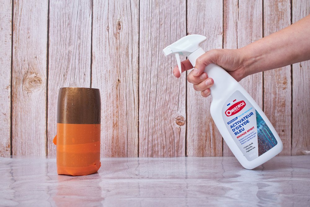 - l’activateur d’oxyde bleu Bronze Spirit (pour le bronze) ou de vert de gris Cuivre spirit (pour le cuivre)
